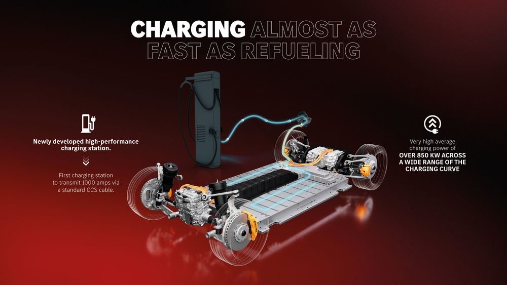 Primerane k nabíjaciemu výkonu vozidla úzko spolupracovala divízia Mercedes-Benz Charging, so spoločnosťou Alpitronic, ktorá je lídrom na európskom trhu v oblasti vysokovýkonného nabíjania. Spoločnosť Alpitronic vyvinula prototyp nabíjacieho stojana. Je to prvý nabíjací stojan, ktorý prenáša takto vysoké hodnoty elektrického prúdu cez štandardný kábel CCS.