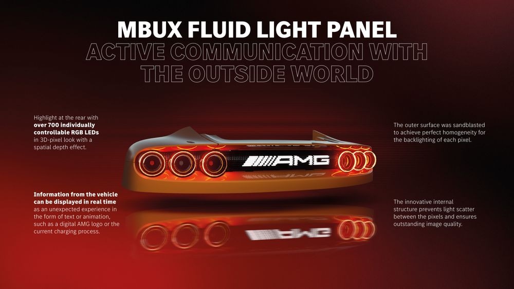 Zaujímavým prvkom na zadnej časti je inovatívny panel fluidný svetelný panel MBUX, ktorý obsahuje viac ako 700 individuálne ovládateľných svetelných diód RGB. Toto moderné inscenovanie svetla umožňuje aktívnu komunikáciu s vonkajším svetom s trojrozmerným vzhľadom pixelov a priestorovým efektom hĺbky. Predná strana bola opracovaná opieskovaním na dosiahnutie dokonalej homogénnosti osvetlenia pozadia každého pixela. Inovatívna vnútorná štruktúra zabraňuje rozptylu svetla medzi pixelami a zabezpečuje vynikajúcu kvalitu obrazu. Vo vypnutom stave má panel elegantný trojrozmerný vzhľad pixelov. Po zapnutí vzniknú vďaka neočakávanému inscenovaniu svetla mimoriadne svetelné efekty.