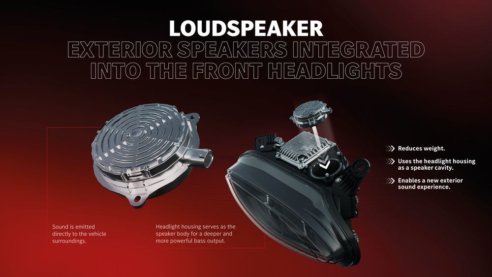 Ďalšia inovácia nanovo prepája svetlo a zvuk: reproduktory, ktoré vydávajú jazdný zvuk do vonkajšieho okolia, sú v štúdii CONCEPT AMG GT XX prvýkrát integrované v predných svetlometoch. Teleso svetlometu využívajú ako dutinu reproduktoru. Takýto spôsob integrácie šetrí konštrukčný priestor, znižuje hmotnosť a umožňuje nové varianty zvuku. Inovatívne reproduktory navyše slúžia ako generátory signálu na ochranu chodcov. K tomu sa pridáva aj technológia pasívnej membrány vo zvukovej lište (soundbar). Táto technológia umožňuje nízkofrekvenčnú a intenzívnejšiu reprodukciu basov, pretože lepšie využíva dostupný konštrukčný priestor.